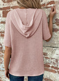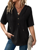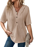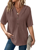 Women's Waffle Knit Button V Neck Short Sleeve Hoodie