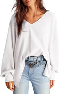 Women's Waffle Knit Tops Long Lantern Sleeve V Neck Oversized T Shirts