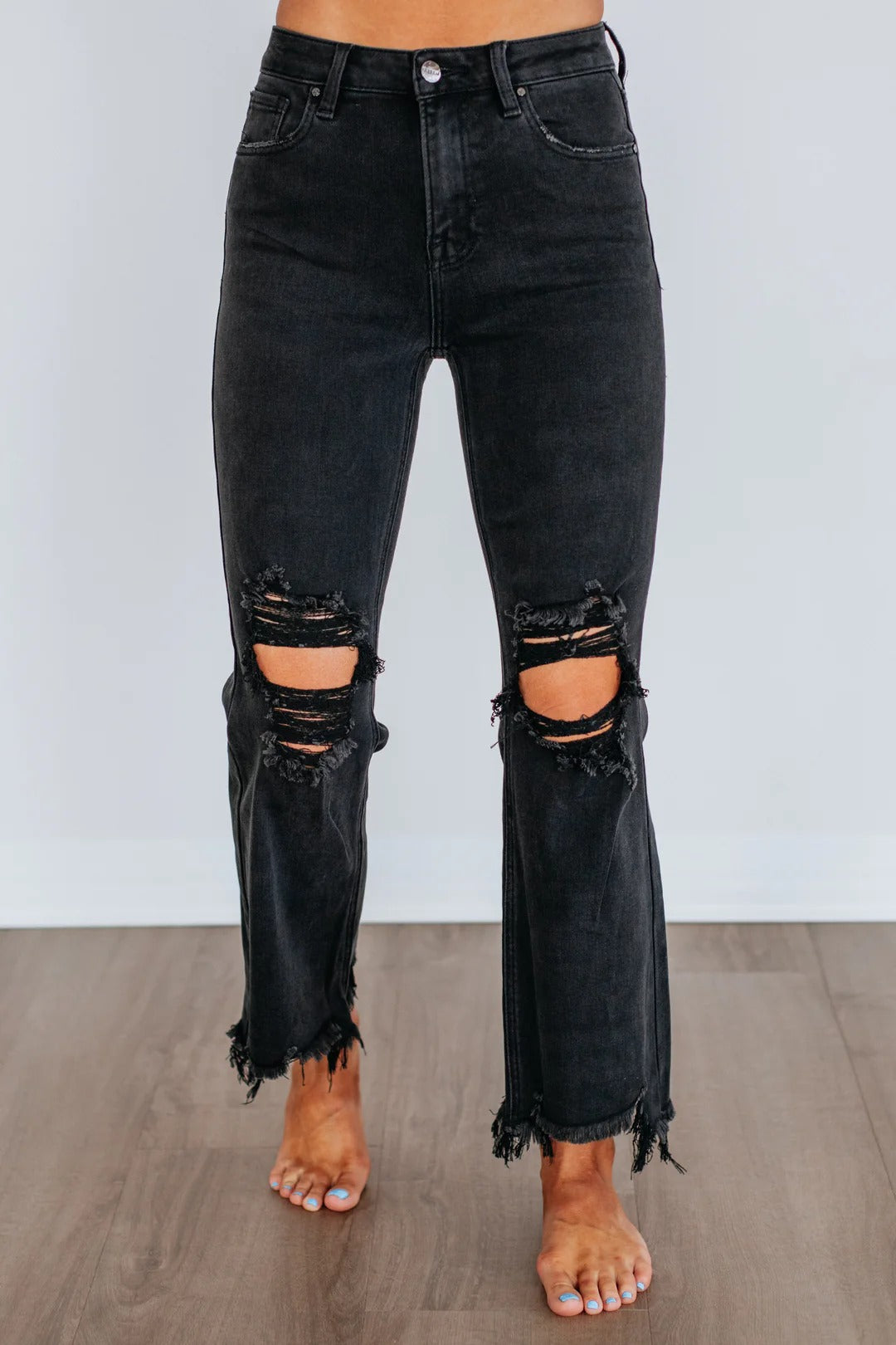 Loose wide leg jeans for many body, fashionable and versatile flare wide leg denim pants. Zipper button closure, classic 4-pocket design, washed distressed raw edge hem treatment process, loose bell bottom leg wear more casual, comfortable.
