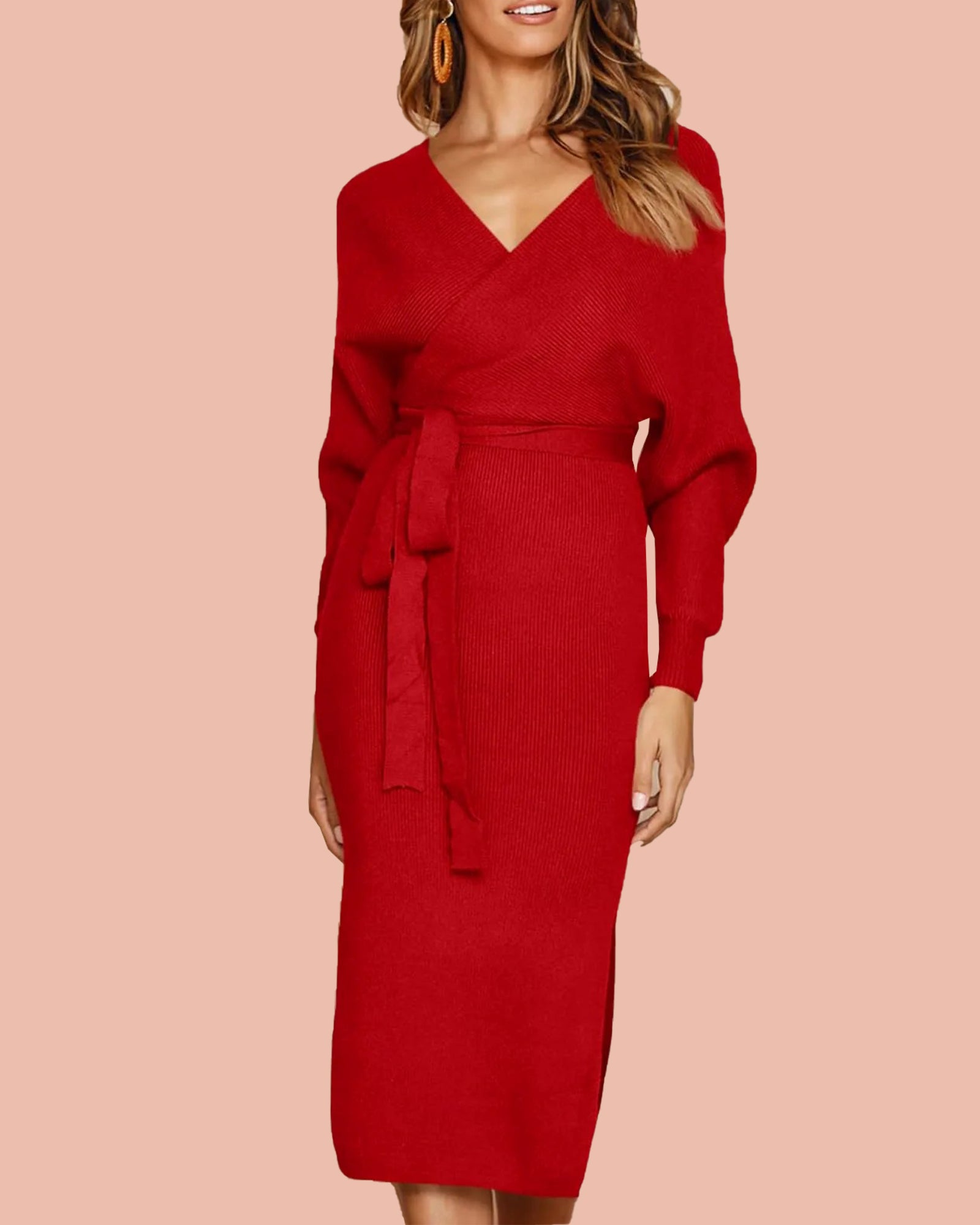 Made from high-quality sweater fabric, this dress offers a comfortable and cozy fit. The bodycon silhouette accentuates your curves, while the included belt cinches your waist for a flattering look. The wrap style with a batwing V neck adds a touch of elegance, while the open back with a slit adds a hint of allure.