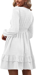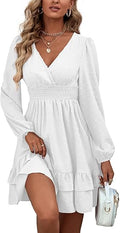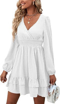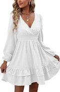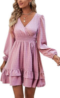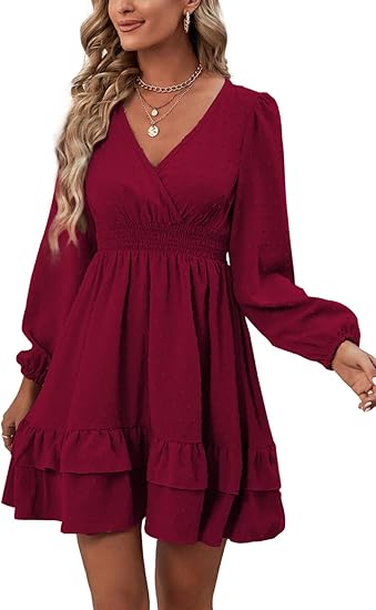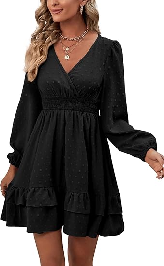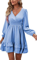 Women's Wrap V Neck Swing Ruffle Swiss Dots Long Sleeve Mini Dress