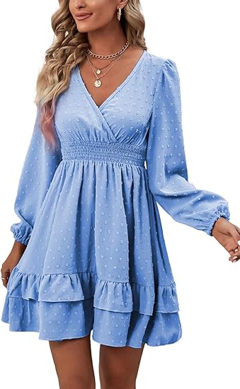 This swing a-line wrap ruffle mini dress with cute swiss dots which is pleasent to wear thanks to its soft, flowing, and lightweight quality. The deep v neckline fully show your elegant and chic neck. The swing and ruffle hem details add more unique and stylish elements. The long lantern sleeve provide a casual look. Elastic pleated waist makes you look slim yet loose fit and comfy, a must-have dress for girl and women.