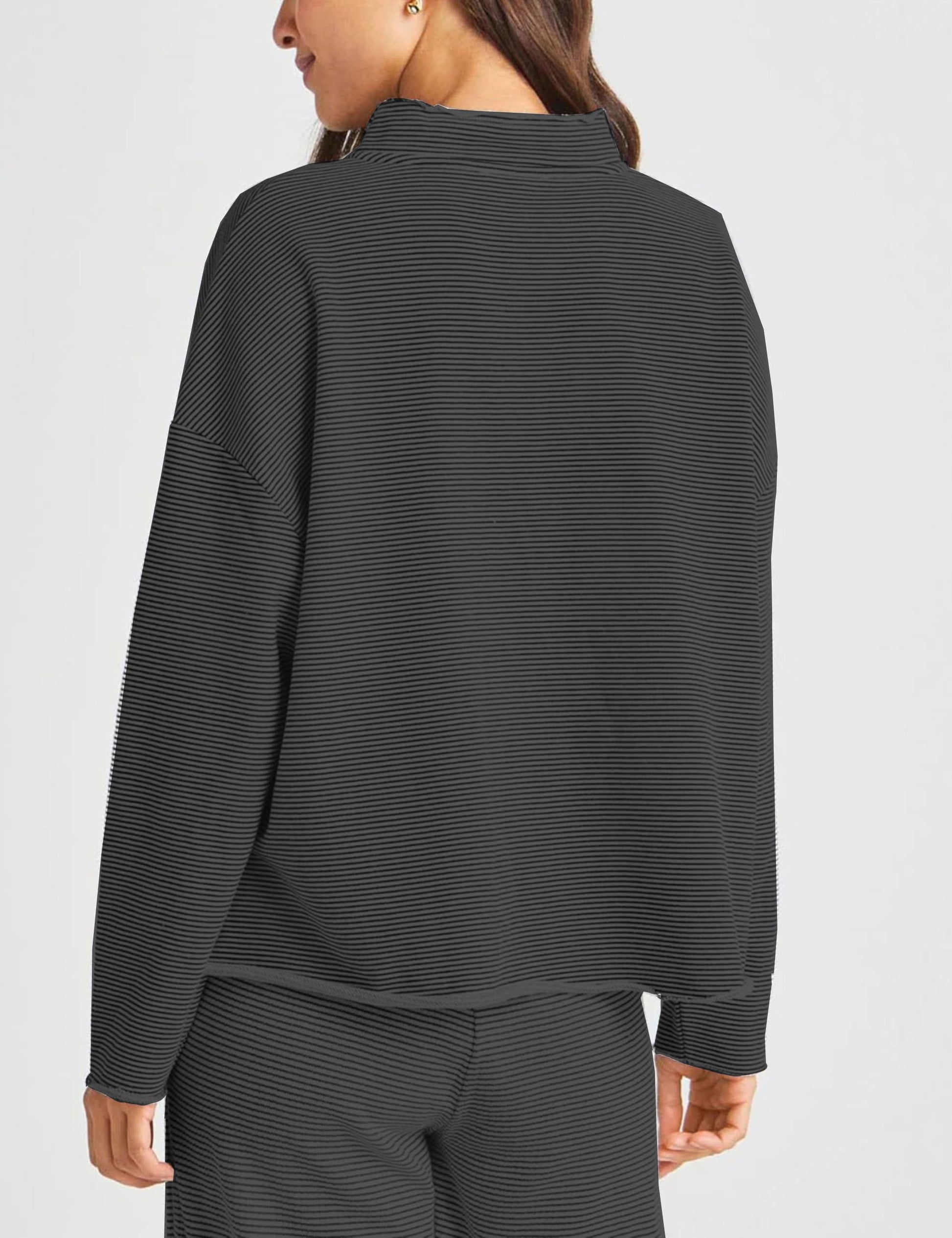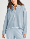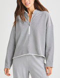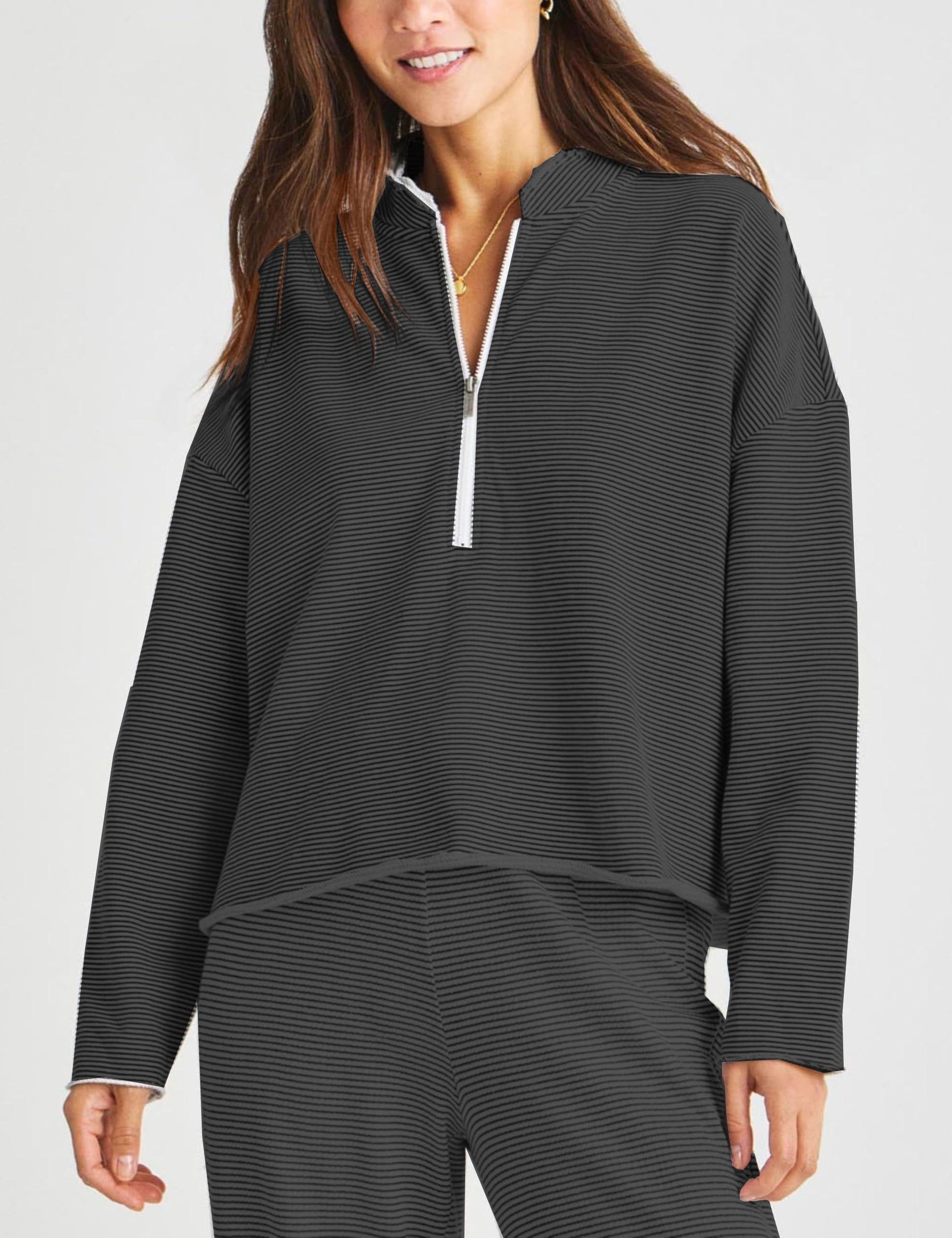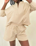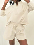 Explore our striped long sleeve top and shorts set for an effortlessly stylish look - this comfortable and chic set features a trendy striped half-zip design, perfect for lounging at home or going out.
